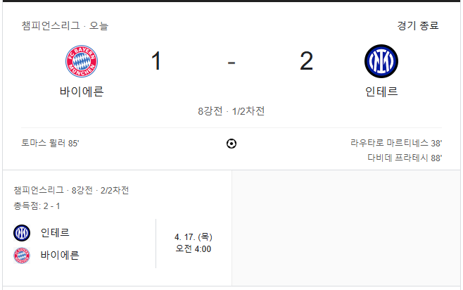 - 📍 최종 스코어: 바이에른 뮌헨 1 : 2 인터밀란